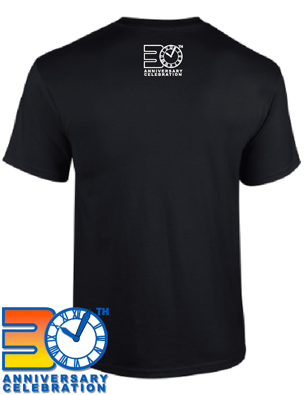 Black shirt with the We’re Going Back 30th Anniversary Logo (with a glow in the dark clock face) .. I know, rad right!?